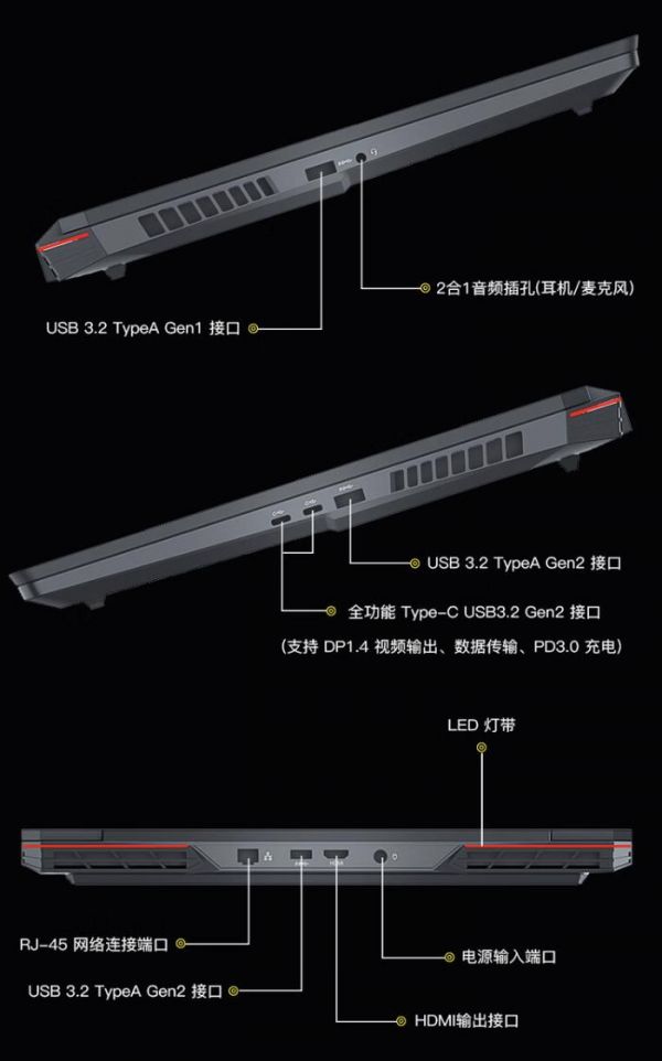 接口方面,这款笔记本配备 2 个 USB-C 3.2 Gen 2 接口、2 个 USB-A 3.2 Gen 2 接口、1 个 USB-A 3.2 Gen 1 接口、1 个 3.5mm 音频接口、1 个 RJ45 接口、1 个 HDMI 2.1 接口。