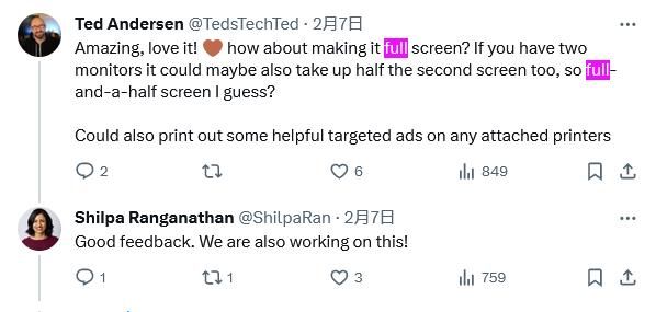 一位用户建议微软为 Copilot 提供全屏支持,Shilpa Ranganathan 澄清说微软正在考虑这个想法。