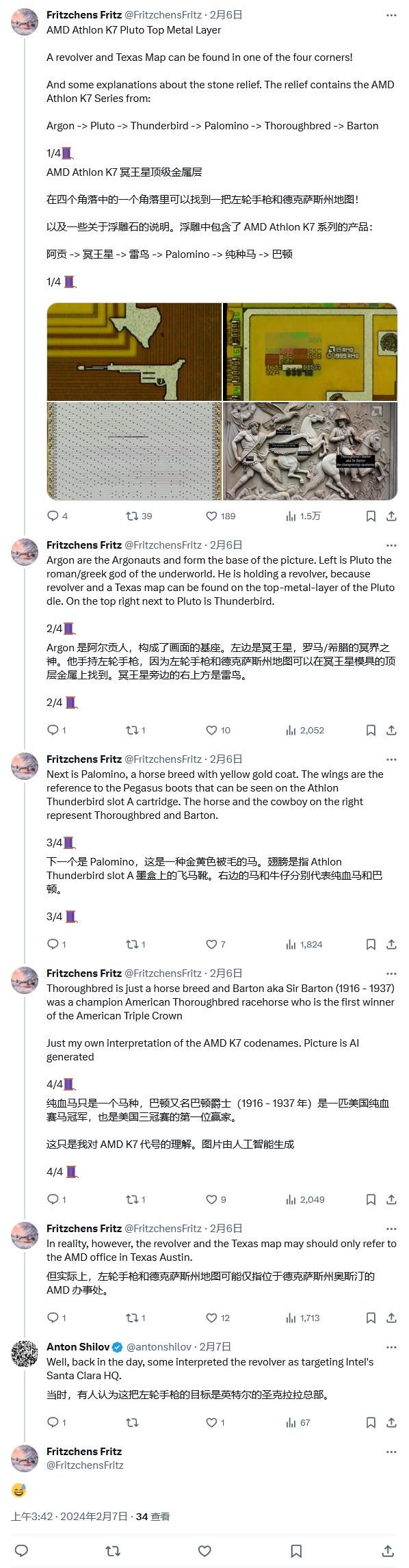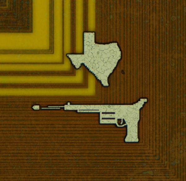 弗里茨使用放大镜检查 Athlon K7 处理器,在角落里发现了美国得克萨斯州的标志,下方还有一张已发出子弹的左轮手枪照片。