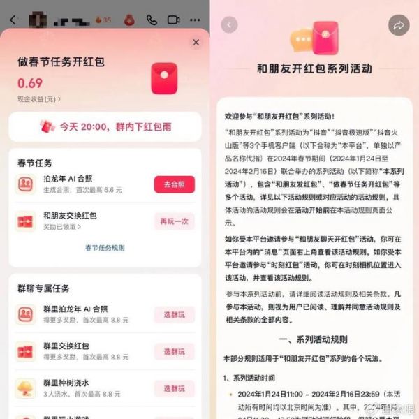 比如,抖音推出了短视频红包功能,让博主可以在短视频上挂载红包,用户可以边刷视频,边领红包;比如抖音在朋友会话框和群聊里上线了专属任务,用户可以通过参与AI合照,交换红包等活动,领取红包奖励;此外,抖音还在抖音群聊里不定时发放红包雨,以及效仿支付宝春节五福的玩法准备了一个“集生肖福”的活动,试图通过这种方式增加对话框打开概率和活跃度。