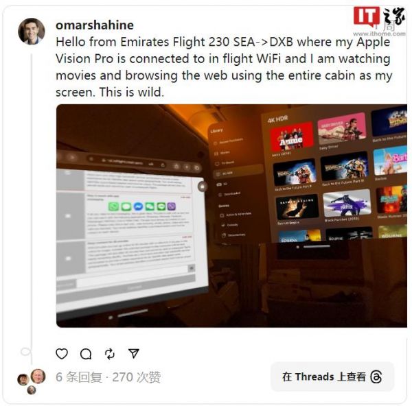 Omar 进一步表示,他对近年来机上娱乐系统的发展印象深刻。有了稳定的网络连接和“大”屏幕显示,你可以在旅途中观看一些你喜欢的节目和纪录片。然而,在他看来,Vision Pro 提供了一种更加卓越和无与伦比的体验。他补充说,机上娱乐系统的界面和体验远远比不上 Vision Pro。