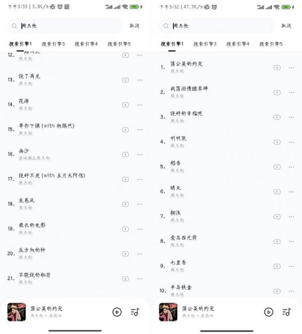周董的歌,只存在于Q音大家想必都知道,简单尝试搜索了一下周董的歌,可以看到每一首都能找得到。该软件内置了五条搜索引擎,以这等恐怖的搜索强度,基本上大家的听歌需求都可以满足了。