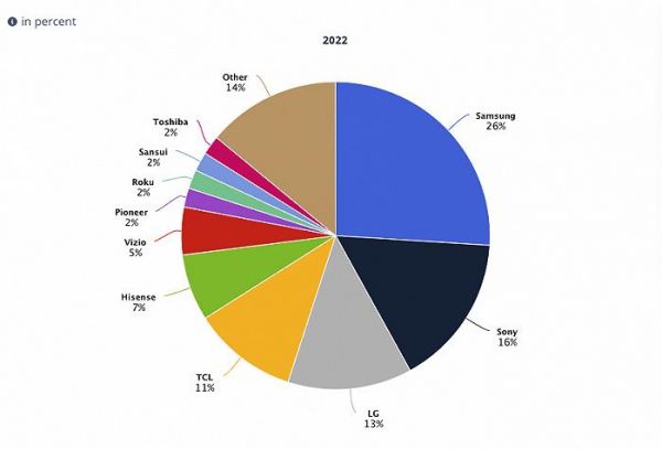 市场份额方面,来自数据机构statista的数据显示,2022年,Vizio在北美智能电视市场份额为5%,排名第六,第1-3名是三星、索尼与LG。