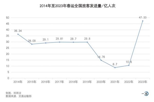 从时间刻度来看,扣除疫情影响,2015~2019年的春运出行人次基本稳定在28~30亿,而到了2023年,总人次上升到47.33亿,涨幅超过50%。