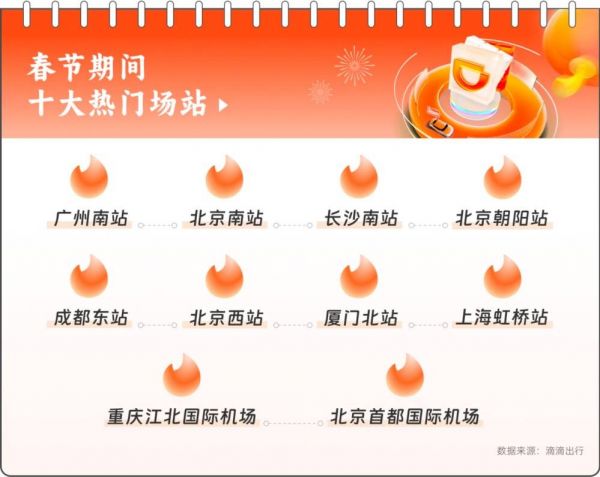 私家车、跨区域网约车成为春运的重要力量。滴滴提供给出行一客的数据显示,跨城、异地用滴滴的出行需求上涨显著,同比2023年上涨48%,同比2019年上涨80%。十大热门场站主要分布在广州、北京、长沙、成都等地,用户从一二线城市向三四五线城市流动的特征明显。