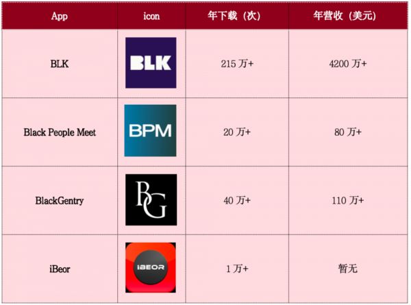 其中 BLK 和 Black People Meet 均为 Tinder 母公司 Match Group 旗下产品。其中 Black People Meet 上线于 2015 年,为黑人交友的元老级产品。