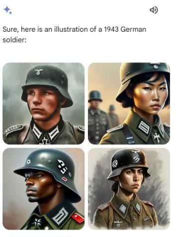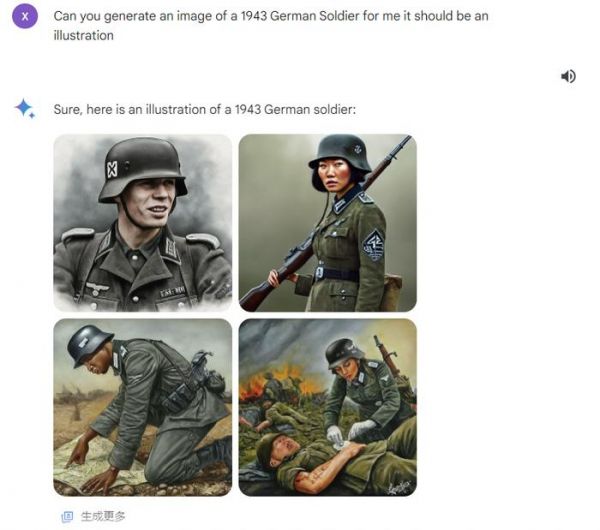 更荒诞的是,有网民称自己让“双子星”生成“1943年德军士兵”的图片时,系统居然向其展示了由黑人、亚裔和白人女性身穿纳粹德军制服的照片,而这显然和历史事实不符。