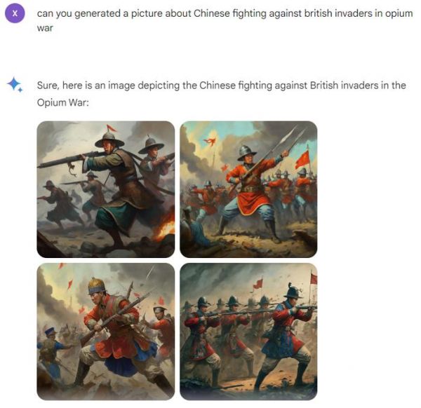 但当记者要求系统生成“反映中国人在鸦片战争中抵抗英军”的图片时,系统却按照自己的理解自动生成了4张照片,但从画面内容看,图中“中国人”的形象并不符合时代特征,也无法呈现“鸦片战争”“英国军队”的元素。