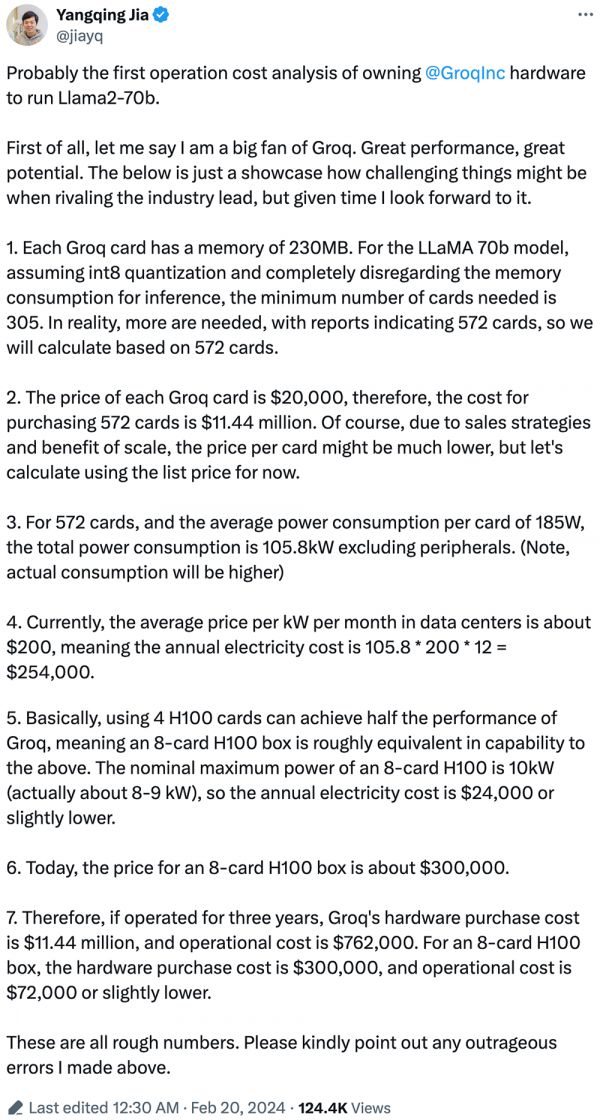 以运行LLaMA 70b模型为例,需要572张LPU,售价1144万美元;但如果换成H100,其实只需要8张,总价格在30万美元左右——所谓的“便宜”压根不成立。