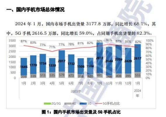 1月国内市场手机出货量同比增长68.1%,达到3177.8万部;