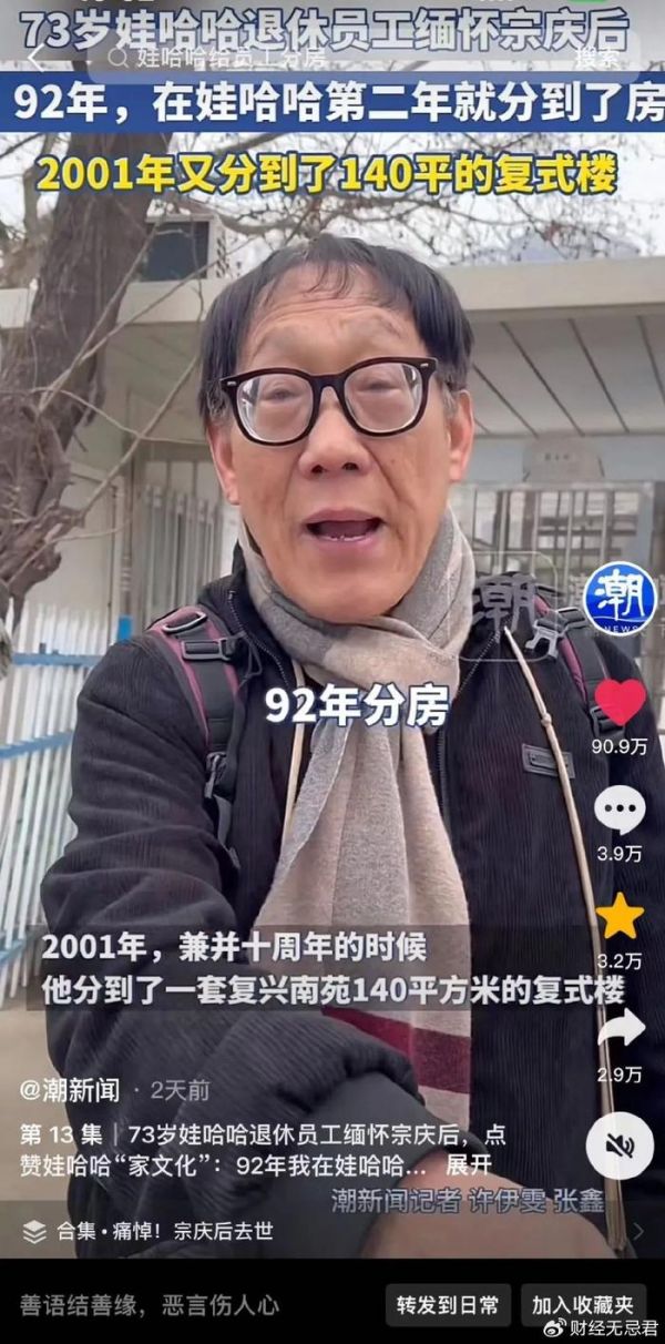 “年终的时候他让我去拿东西,结果公会里没人,后来听到这么个消息(宗庆后去世)。”每次过年,娃哈哈都会给员工发礼物,没想到今年迎来的却是厄运。谈及宗厂长,92岁的退休老员工潸然泪下,不停地重复“他人很好。”