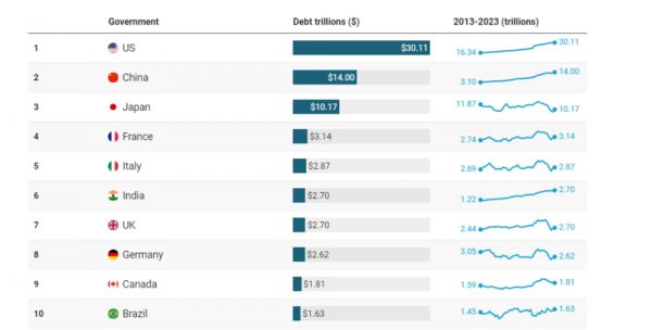 国际金融协会(IIF)在《全球债务监测》报告中表示,2023年全球债务再创历史新高,达到了313万亿美元,增幅超过15万亿美元。而在发达国家中,主要由美国推动。美国政府的公共债务规模全球第一,截至2023年底,其总额已突破34万亿美元。