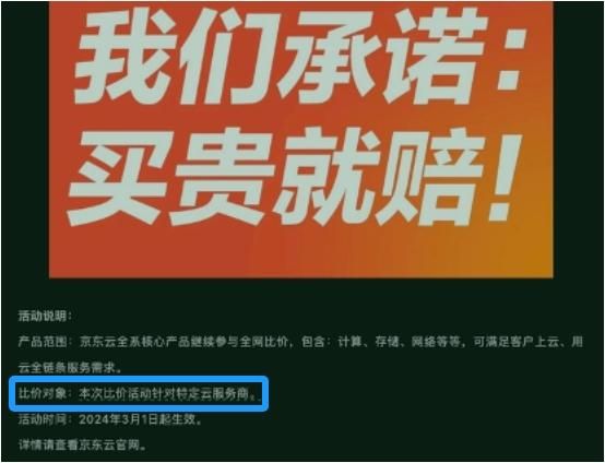 图片里的说明更有意思,产品范围是京东云全系核心产品继续参与全网比价,包含计算、存储、网络等产品,可满足客户上云、用云全链条服务需求;