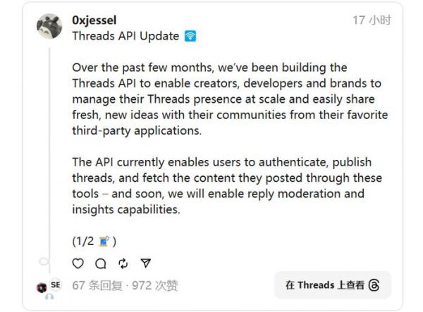 Meta 旗下社交媒体 Threads 计划于 6 月底发布其 API,该平台已进行有限的合作伙伴测试(包括 Hootsuite、Sprinklr、Sprout Social、Social News Desk 和 Techmeme)。