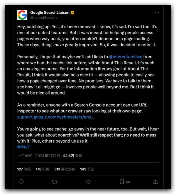 Danny Sullivan 在 X 平台(原推特)上的声明截图从去年 12 月开始,用户发现网页快照功能时而有效时而失效,现在在 Google 搜索中已经很难看到这类链接了。虽然网页快照的按钮已不可用,用户仍然可以通过直接访问特定的 URL 或在 Google 搜索中输入“cache:”指令加上网址来访问网页的缓存版本。目前,例如 Ars Technica 网站的网页快照仍然可用。与此同时,Google 已删除了所有有关网页快照的支持页面。