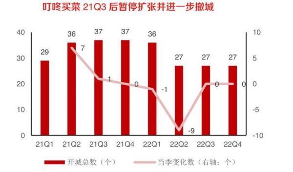 2022 年,叮咚买菜接连关闭了珠海、唐山、宣城、天津、厦门等站点;2023 年前后又暂停了成都、重庆、西南市场的运营,以及关闭了广州、深圳共 38 个站点。当前的叮咚买菜 App 上,包括苏州、上海、北京在内,已开通的城市有 25 个,其中江浙一带占据大头,较高峰期的 37 座城市缩水近 30%。