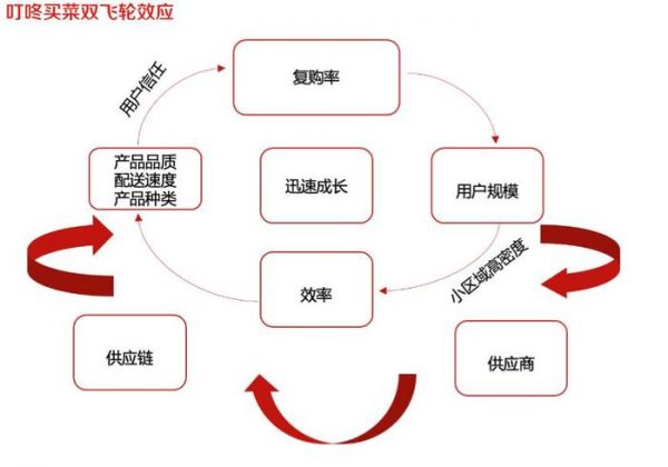 新眸曾从理论上解读过能支撑叮咚买菜增长的 " 双飞轮模式 ",用更好的用户体验吸引新用户,进一步驱动采购增加,此时总订单增长,而从供应端角度,规模性的订单能够提升对上游的议价能力;另一个飞轮是对已有数据进行分析,进一步优化运营细节,提升运营效率。