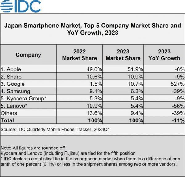 事实证明,谷歌的Pixel 手机在日本越来越受欢迎。事实上,根据 Counterpoint Research 的数据,该品牌在 2023 年第一季度的出货量排名第二。看起来 Pixel 在市场上正在持续增长,IDC 2023 年第四季度的数据显示,出货量比一年前增长了 527%。事实上,谷歌是本季度唯一实现增长的智能手机品牌。不过,这一表现并不足以让谷歌在日本保住第二名的位置,以微弱的差别输给了夏普。但这仍然标志着市场份额的大幅增长,从一年前的 1.5% 增加到 10.7%。