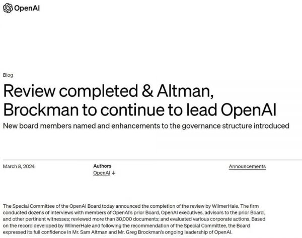 董事会还宣布大改OpenAl治理结构,并将调查结果的摘要公之于众。