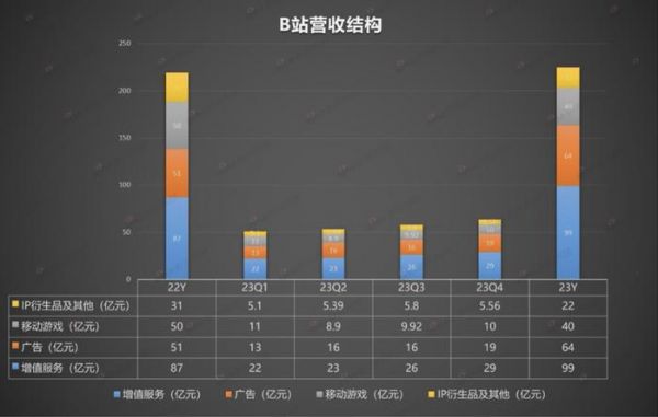 但是从营收层面来看,受到移动游戏和IP衍生品两个业务营收倒退的掣肘,2023年B站营收仅同比增长3%至225亿元,低于240亿-260亿元的预期,同时增幅低于2022年的13%。