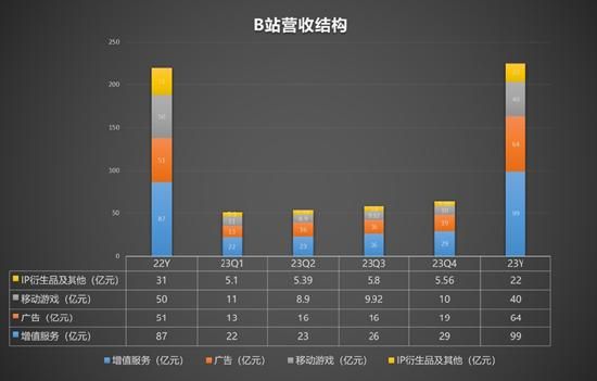 但是从营收层面来看,受到移动游戏和IP衍生品两个业务营收倒退的掣肘,2023年B站营收仅同比增长3%至225亿元,低于240亿-260亿元的预期,同时增幅低于2022年的13%。