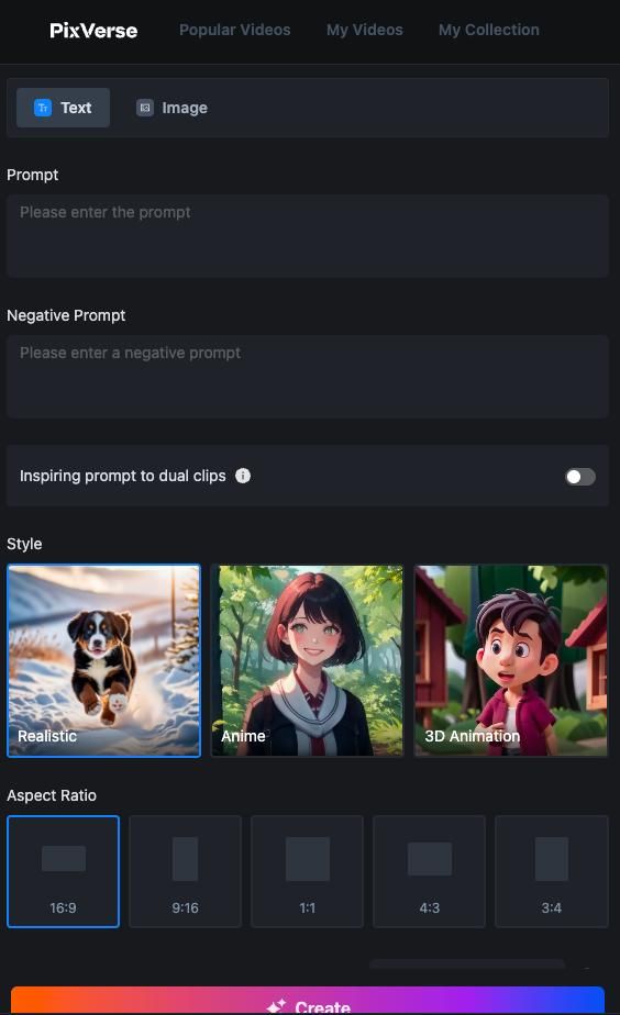 以文生视频功能为例,PixVerse产品界面有Prompt 、Style、Aspect-ratio、Negative-prompt四个功能参数,其中Prompt 指的是需要输入的一段句子或关键词语;Style 决定了视频画面的风格;Aspect-ratio决定了视频的画幅比例;Negative-prompt 帮助规避视频中用户不想呈现的内容,用文字表达即可。