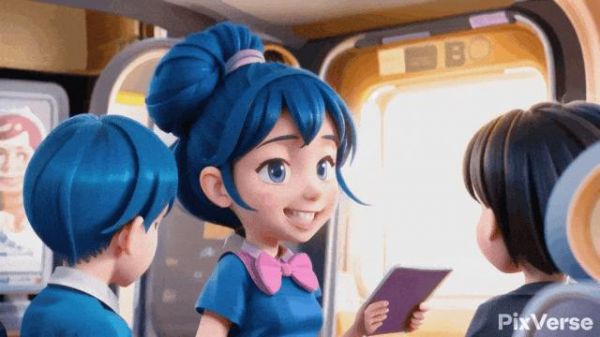 比如,输入Prompt:a little girl with bun hair wear flight attendant blue uniform stand in the plane cabin. she smile to the passanger,就可以得到下面这段4秒的视频。