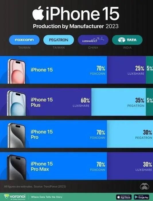 苹果依靠四家合同制造商来组装不同的 iPhone 型号。可以说与苹果关系最密切的一家公司是中国台湾的富士康,根据 Visual Capitalist 援引 TrendForce 汇编的数据,富士康负责生产 70% 的 iPhone 15 机型。此外,25% 的 iPhone 15 手机由中国大陆厂商立讯精密代工。其余 5% 则由印度塔塔公司建造。