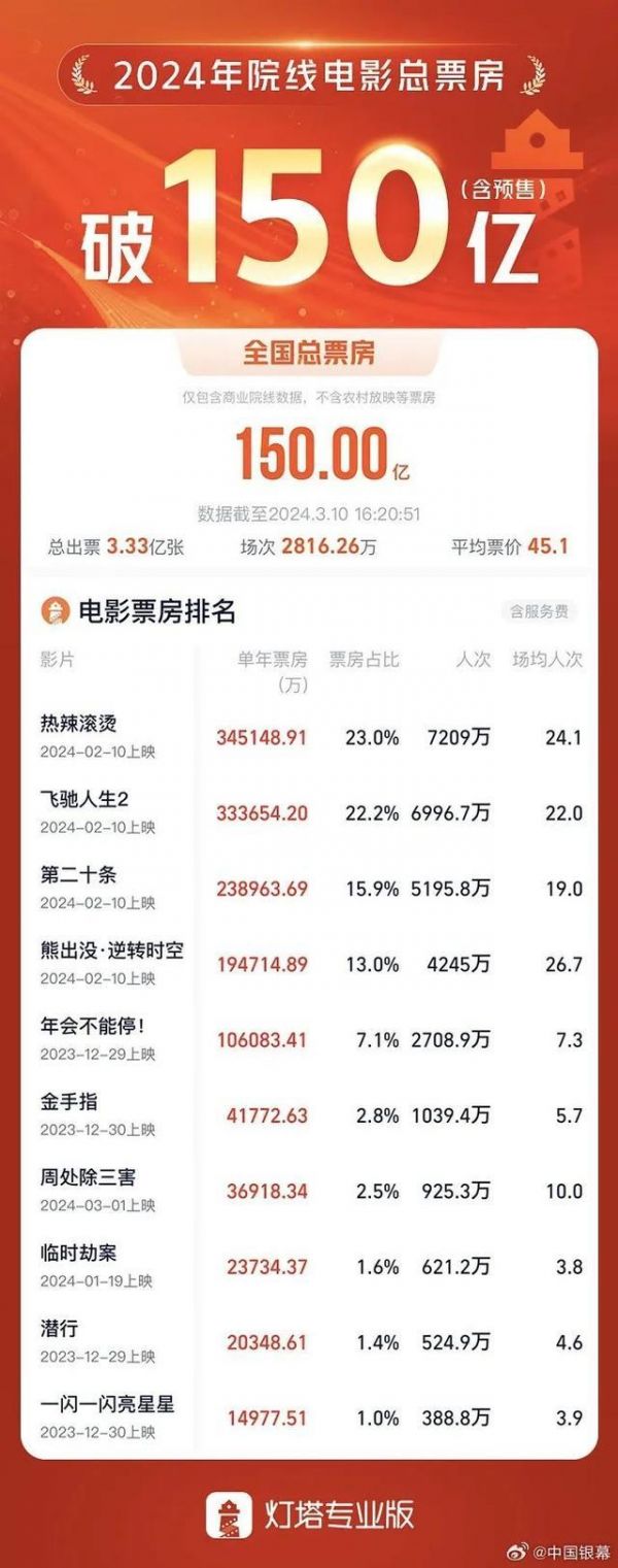 据网络平台数据显示(灯塔专业版数据),截至3月10日,2024年度大盘票房(含预售)突破150亿!