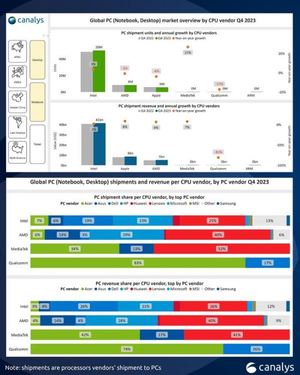 3月13日消息,根据市场调查机构Canalys公布的最新报告显示,2023年第四季度,Intel以5000千万颗的出货量,占据了PC处理器市场份额的78%,同比增长了3%。