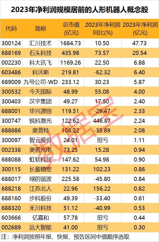 以净利润规模看,汇川技术、石头科技、科大讯飞、科沃斯、九号公司-WD的2023年净利润规模靠前,依次为47.73亿元、20.54亿元、6.88亿元、6.4亿元、5.87亿元。