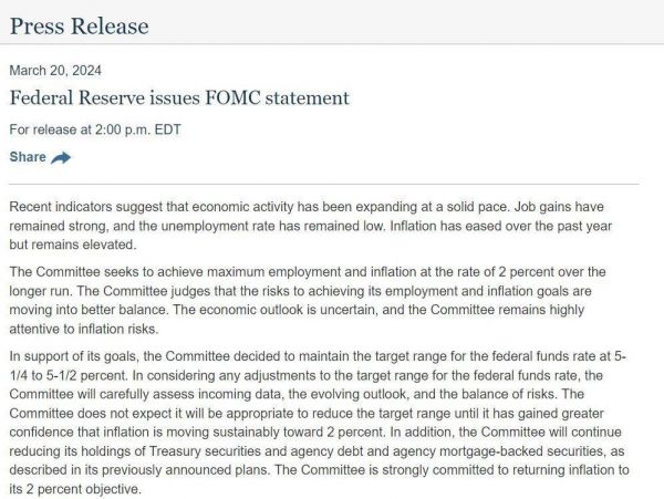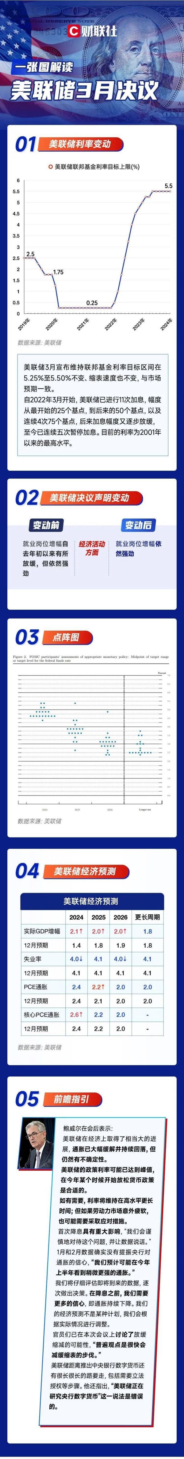 北京时间周四(3月21日)凌晨,美联储宣布仍继续将联邦基金利率目标区间维持在5.25%~5.50%之间,这是自去年9月以来连续第五次维持利率不变。