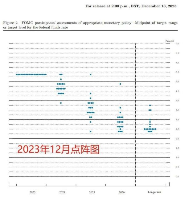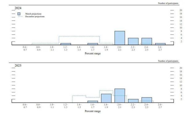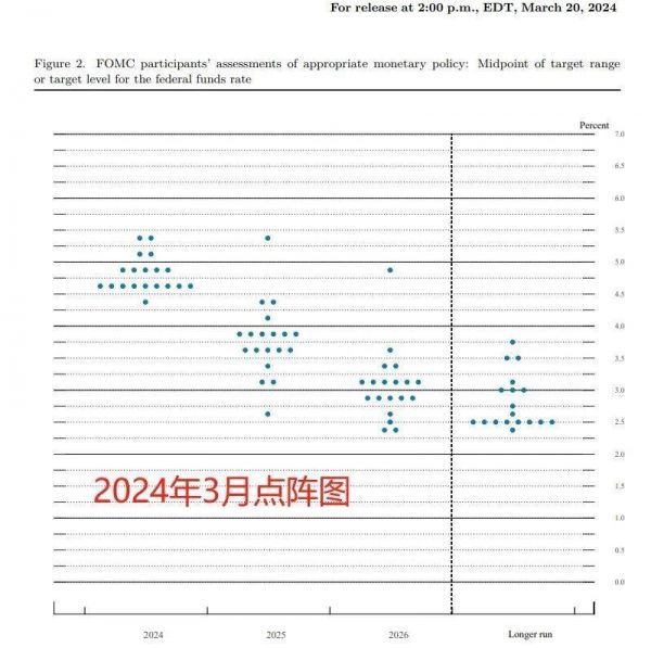 根据刚刚发布的点阵图,FOMC委员们对2024年底联邦基金利率的中位数预期依然维持在4.6%,但对2025和2026年的政策利率中位数预期抬高至3.9%和3.1%。在去年12月的预期中,委员们对2024年底的中位数政策利率预期为4.6%(年内降息3次),对于后续两年的预期则为3.6%和2.9%。