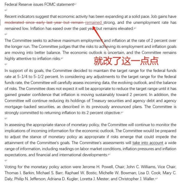 从利率决议本身的变化来看,3月决议文本与1月决议唯一的差别,就是将开头的“就业岗位增幅自去年初以来有所放缓,但依然强劲”改成了“就业岗位增幅依然强劲”,仅此删改了几个单词而已。