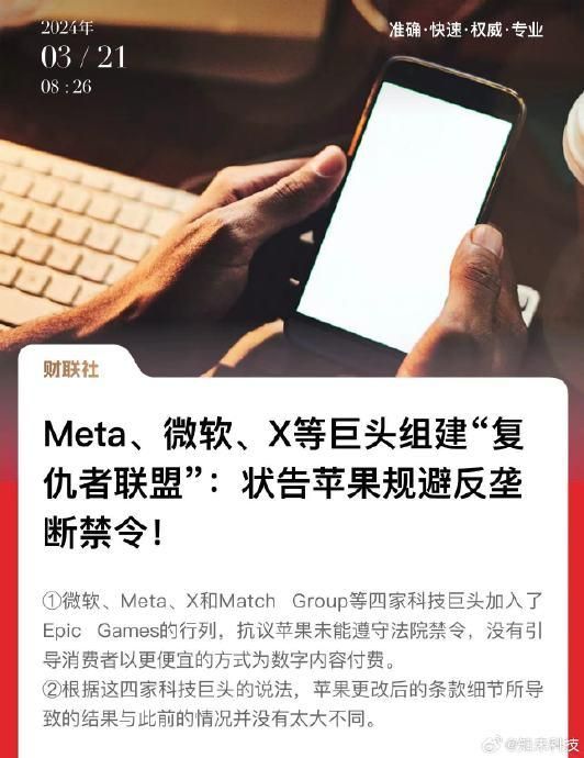 当地时间3月20日,微软、Meta、X和Match Group等四家科技巨头加入了Epic Games的行列,抗议苹果未能遵守法院禁令,没有引导消费者以更便宜的方式支付数字内容。苹果必须在4月3日之前正式回应这些起诉。