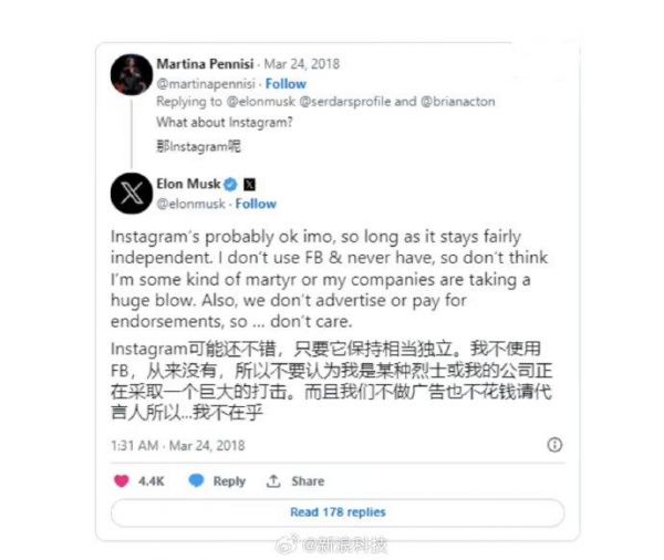 2018 年 3 月,马斯克删除了特斯拉在 Facebook 的页面,他后来澄清说,这么做只是因为不喜欢 Facebook,他个人从未使用过 Facebook,他的公司也不会在该平台投放广告或寻求代言。马斯克称,“我就是不喜欢 Facebook。让我毛骨悚然。对不起。”