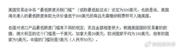 1930年年代,美国修订了关税法里的第321条,规定了一个“最低限度”原则。大概的意思是说,从国外买东西回到美国后,如果低于一定数值,就可以免税。
