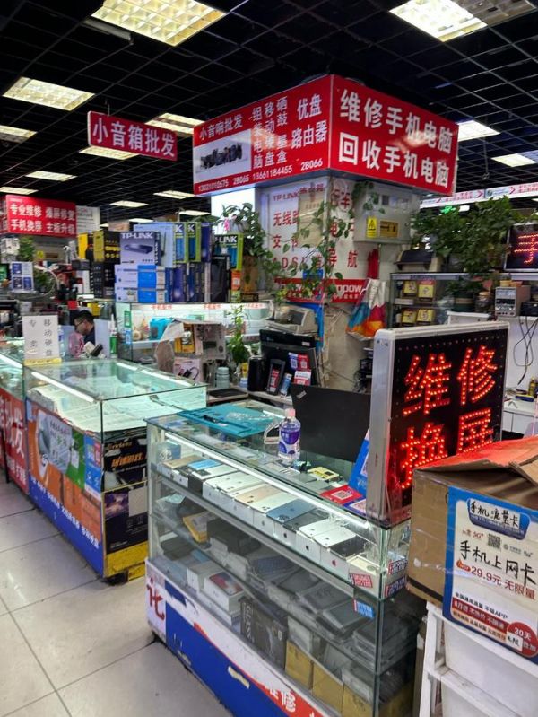 在中关村科贸电子城,商户柜台上贴着“回收手机”的广告。
