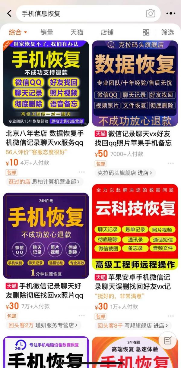 然而,在网购平台上,存在大量自称可以进行数据恢复的店铺。记者向两家网店咨询恢复出厂设置后能否找回数据。一家店铺客服立即表示“可以操作”,另一家的客服则在询问过品牌、型号后,称可以先下单检测试试。两家店铺都在服务声明中指出“本店仅对自己的设备进行恢复”,但对于顾客是不是手机机主,客服并没有进行询问。