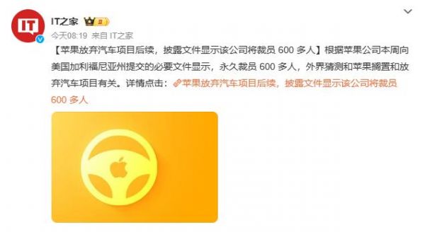 苹果放弃汽车项目后续,披露文件显示将裁员600多人