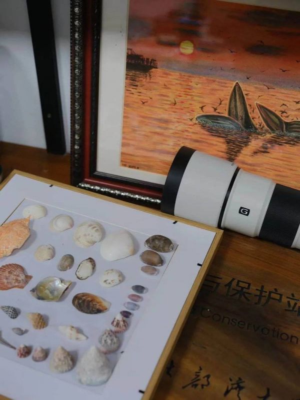 几张中国鲸类科普海报贴在大办公桌旁的白板上:大如长须鲸北方亚种、抹香鲸,小如灰海豚、长江江豚……墙上钉着团队首次发现布氏鲸后发表的论文:《Occurrence of Bryde's Whales, in the northern Beibu Gulf, China》。在办公室右侧的木桌上,一个盒子里收藏了形形色色的贝壳,旁边立着一幅朋友到涠洲岛观鲸后送给陈默的画。画面上,夕阳将天空与海洋染成了金橙色,云霞之下,几头布氏鲸探出水面,张着大嘴,周围海鸟环绕,远处的船上有几个观鲸的人。