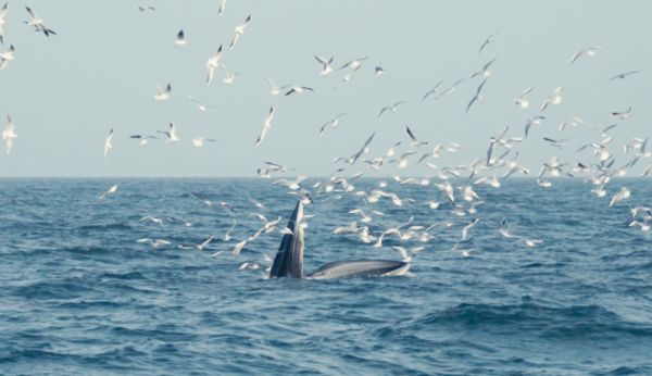 出海前一天,陈默在他位于涠洲岛上的一间办公室向我们展示了团队数年来的科研考察视频:灰黑色的“小山”在海面起伏,有时喷出 2~3 米高的水柱,一张大嘴缓缓伸出水面,无数条小鱼在其中跳跃,引来成群的海鸥扑闪着翅膀相随。