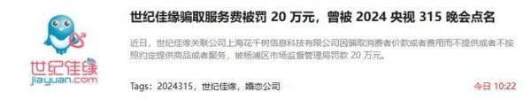 在315晚会中,占了较长篇幅的世纪佳缘,被官方部门罚款20万元。