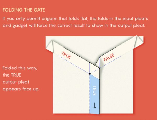 其中两个输入褶被送入一个复杂的褶皱数学编译小工具。小工具对逻辑运算进行编码。为了在完成所有这些折叠的同时还能使纸张折叠平整——这是赫尔和扎卡雷维奇提出的要求——他们加入了第三个褶皱,迫使它以特定的方式折叠。如果褶皱以一种方式翻转,则表示输出为“真”。若翻转向另一侧,则输出为“假”。