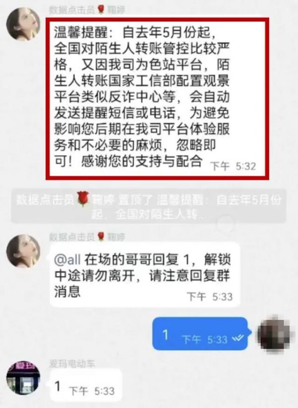不法分子先通过自爆是因为提供色情服务,才会导致用户收到96110、银行等转账风险预警,消除大家的心理顾虑。