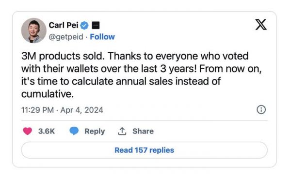 最近,一加联合创始人、Nothing 创始人兼 CEO 裴宇在 X 平台上宣布了一个消息:Nothing 成立三年,产品销量已经超过了 300 万部。
