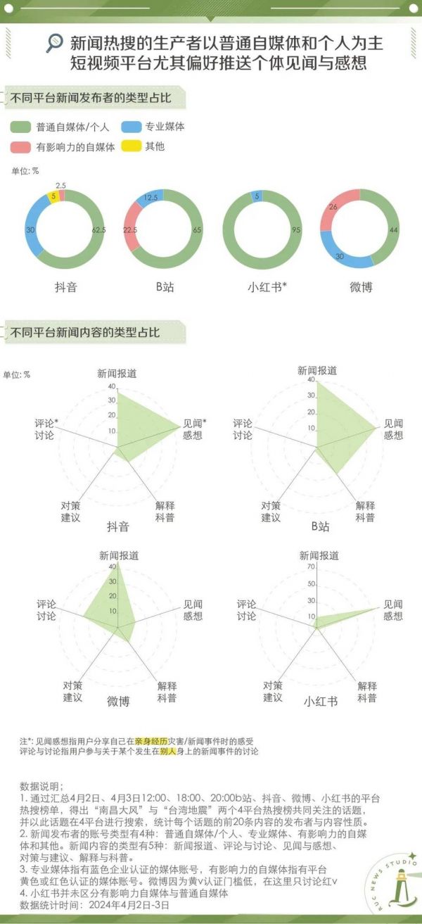 我们选取了抖音、B站、小红书、微博四类社交媒体,以近期4个平台共同的热点话题“南昌大风”与“台湾地震”为例,在4个平台进行搜索。通过分析发布者的身份发现,四类社交媒体的内容发布者大多都是普通自媒体与个人。社交媒体里,每个人都有可能被看到,社会事件下个人无意的俏皮话可能爆火,对事实真相阐述的努力也可能湮没在众人言语中。