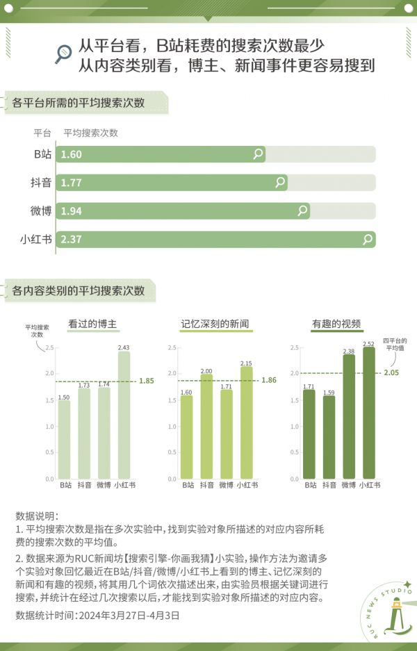 在抖音、小红书、微博、B站这四类社交媒体上,37名实验对象向我们描述其看过119条印象最为深刻的博主、新闻和视频信息,我们通过搜索其描述的关键词来找寻原贴,并记录下从开始搜索到找到参与者心中所想的视频的过程中,需要按下多少次“搜索”。