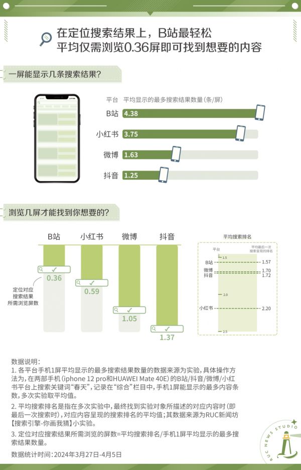 移动端一屏可容纳的信息量和应用软件的界面设计,影响了用户定位检索结果的难易程度。与搜索引擎不同,社交媒体更多地采取沉浸式下拉而非翻页式的刷新方式。为了了解不同社交媒体平台间的差异,我们在四个平台上搜索关键词“春天”,并计算“综合”栏中可显示的最多内容的平均值。最后发现,B站一屏可显示的搜索结果最多,达到4.38条,而以竖屏短视频为主的抖音一屏最多可显示1.25条,不到B站的三分之一。