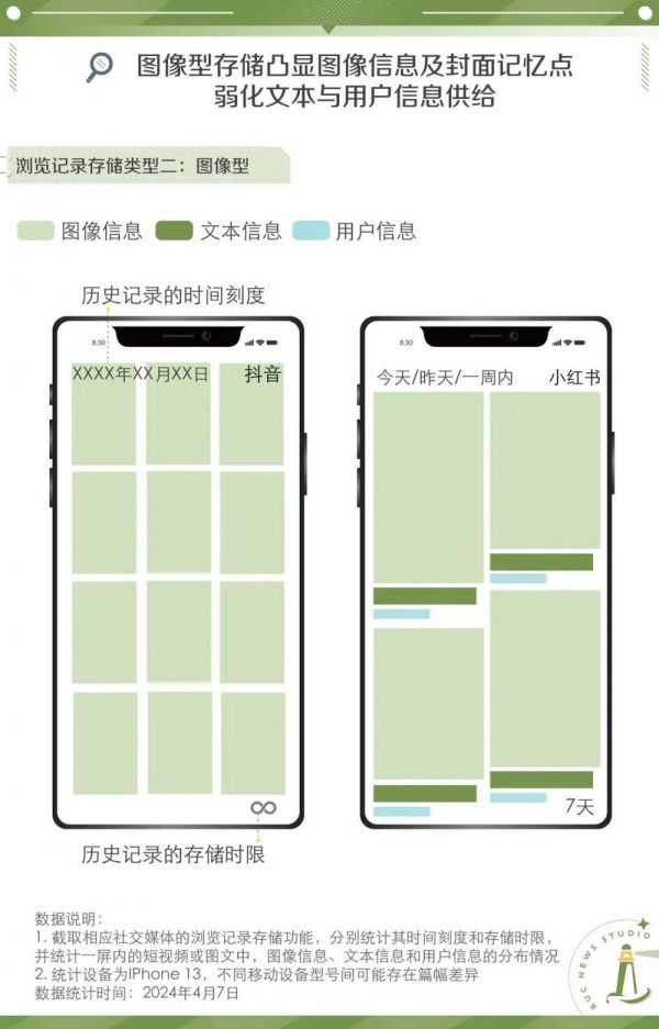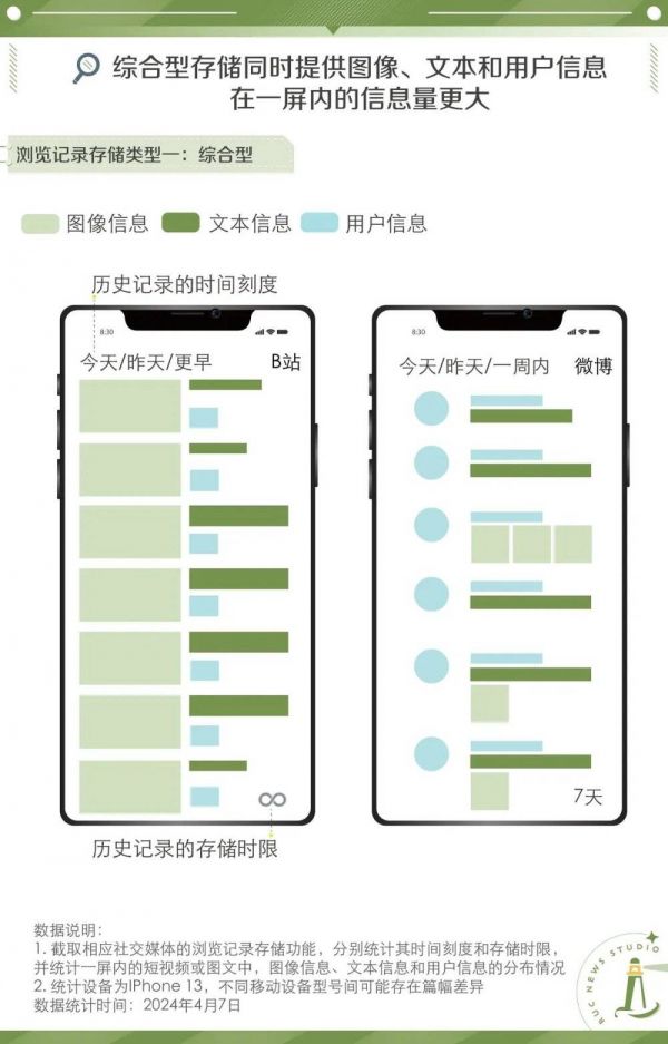 在基于各个平台的界面设计可视化的基础上,根据图文占比的差异,我们将四类社交媒体的浏览记录存储类型,划分为综合型与图像型。B站和微博属于综合型,图像信息、文本信息、用户信息有着较为均匀且醒目的标识;抖音和小红书则属于图像型,浏览记录以图片为主。